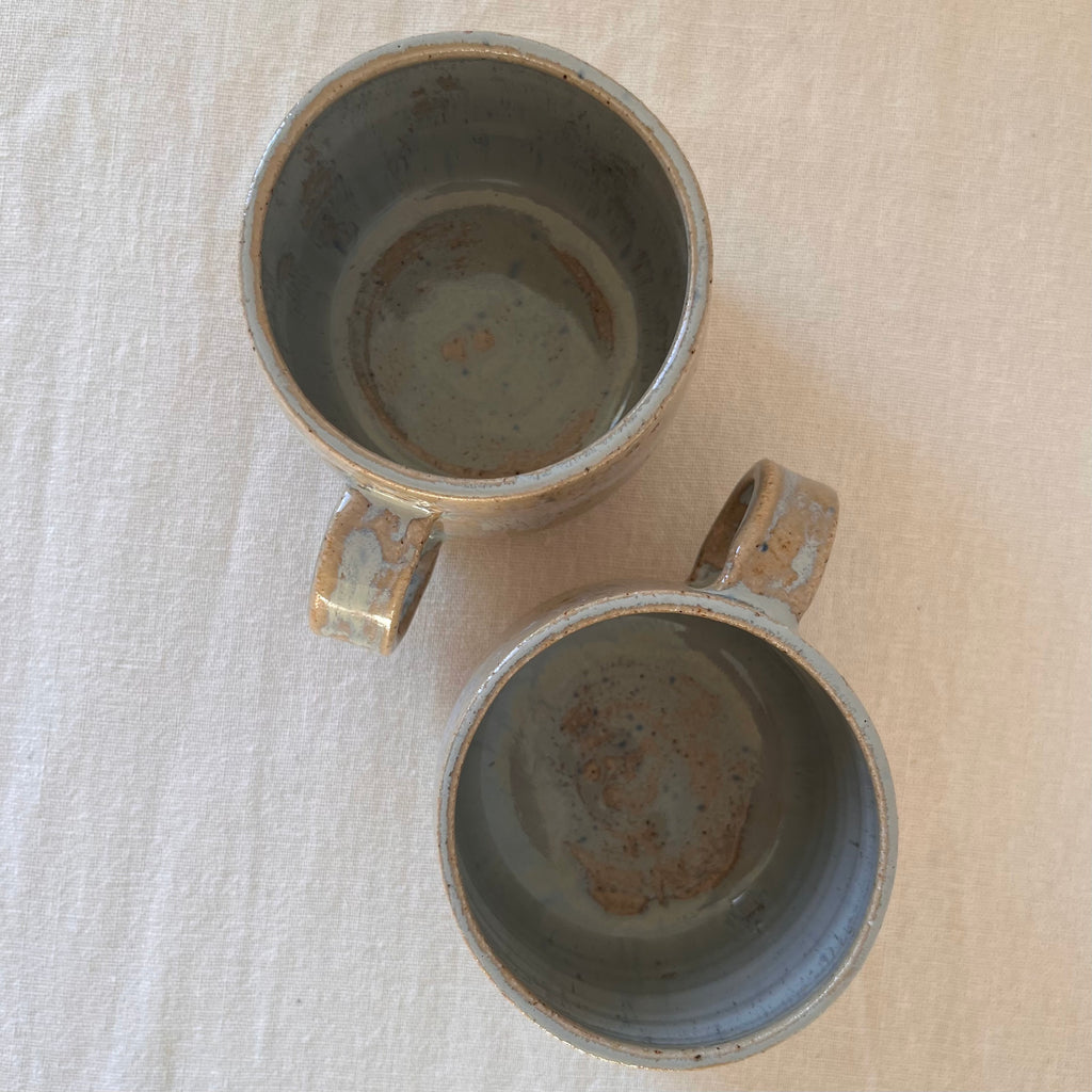 Wheel thrown stoneware mug set finished with coastal inspired painterly glaze. Each holds 350ml.Approximate size 7.5x8cm.